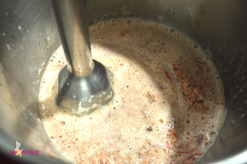 Cuando estén todas peladas añadimos dos cucharones de la leche de cocción al bol de las cáscaras y batimos bien con la batidora.
